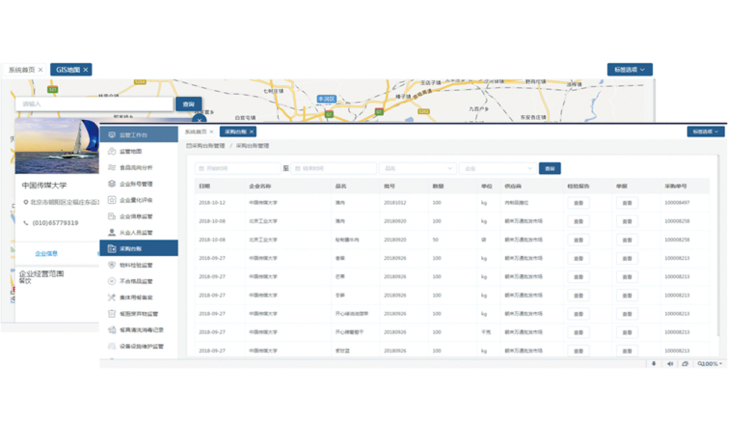 包括監管工作臺、監管地圖、菜品流向分析、餐飲企業賬號管理、餐飲企業量化評級、企業信息監管、從業人員監管、采購臺賬、物料檢驗監管、不合格品監管、集體用餐備案、餐廚廢棄物監管、餐具清洗消毒記錄、設備設施維護監管、菜品留樣監管、綜合預警統計、產品追溯、明廚亮灶等功能。