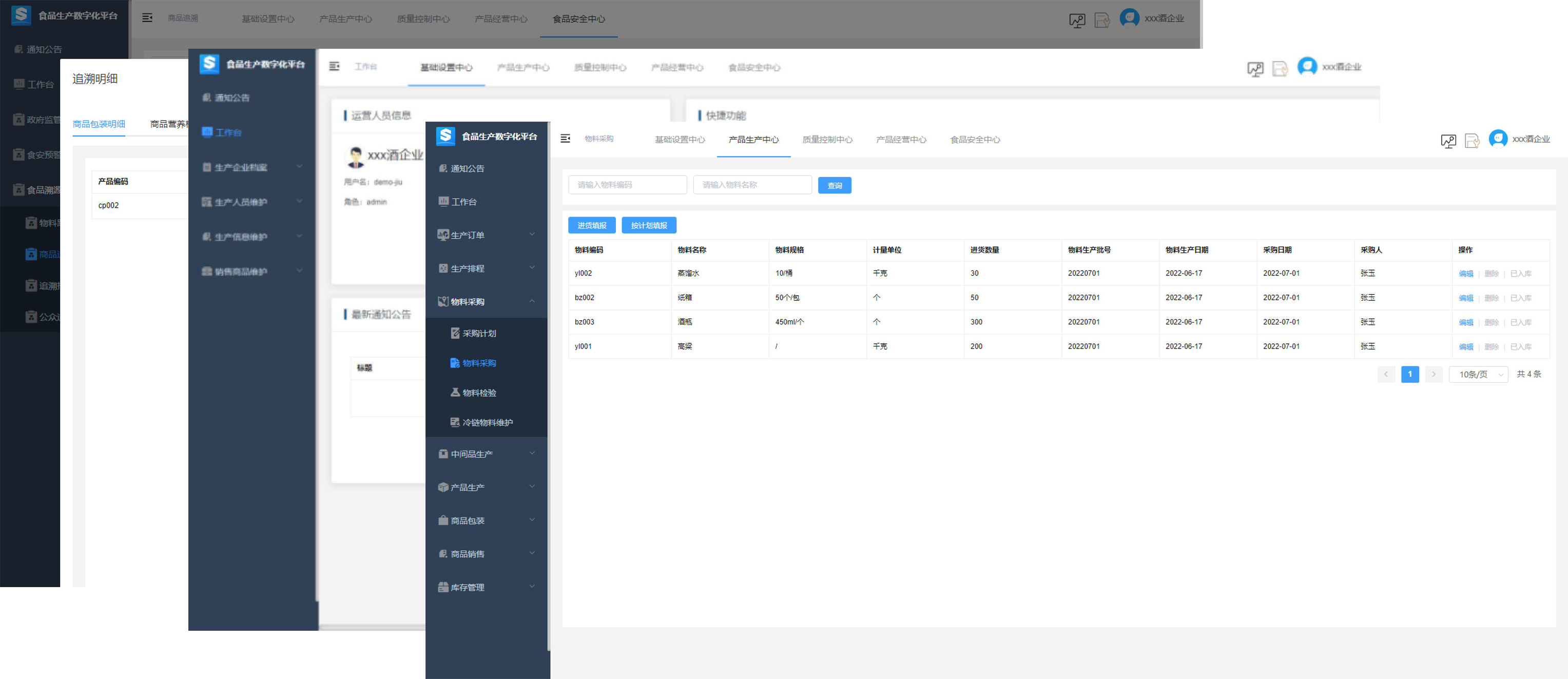 平臺包含基礎設置、產(chǎn)品生產(chǎn)、質(zhì)量控制、產(chǎn)品經(jīng)營、食品安全、生產(chǎn)數(shù)據(jù)等6個中心,上百個功能,還有防偽防竄貨、門店管理、多級分銷、消費者信息、物料采集平臺等增值服務,幫助企業(yè)完成數(shù)字化轉(zhuǎn)型。